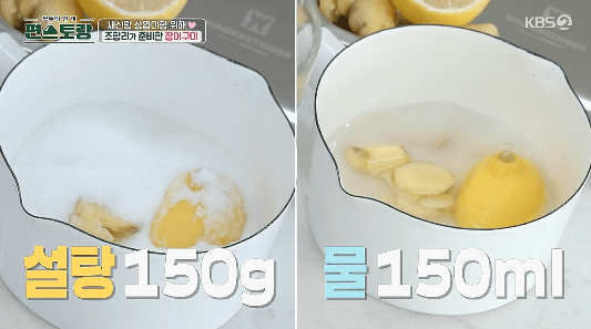 2. 생강 3강을 얇게 슬라이스해서 잘라서 냄비에 넣습니다.