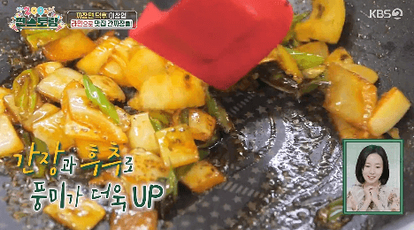 6. 채소들을 프라이팬의 한쪽으로 몰아주고, 빈 공간에 간장을 간장을 붓고 태우듯이 조리합니다.