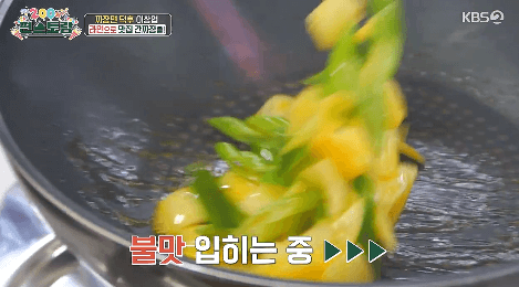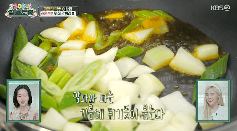 4. 썰어둔 양파와 파를 팬에 넣고, 튀기듯이 볶아줍니다.
