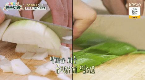1. 양파 1/2개를 깍둑썰기합니다. 대파는 큼직하게 썰어줍니다.