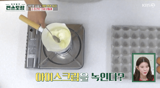 1. 바닐라 아이스크림 6큰술을 냄비에 넣고, 약불에서 녹여줍니다.