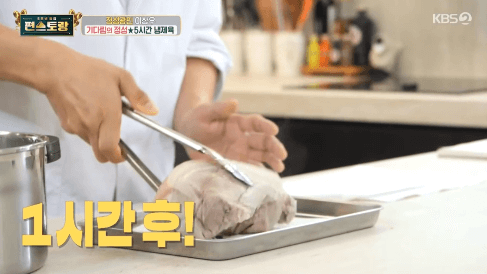 잘 익은 돼지고기를 차갑게 숙성시켜서 보쌈처럼 먹는 요리입니다. 차갑게 먹는 요리라 여름에 먹어도 좋을 것 같습니다. 이상우씨는 당근김치와 같이 곁들였는데, 냉면과도 잘 어울린다고 합니다.