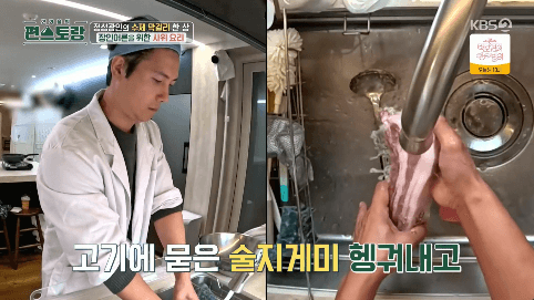4. 2시간 후 고기에 묻은 술지게미를 씻어냅니다.
