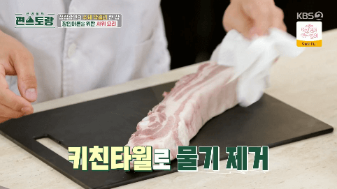 1. 통삼겹살의 핏물을 키친타월로 닦아 줍니다.