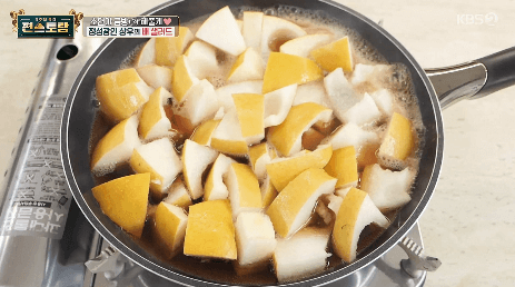 4. 자투리 배를 넣고, 약불에서 30분간 끓이면서 졸여줍니다.