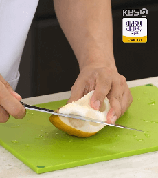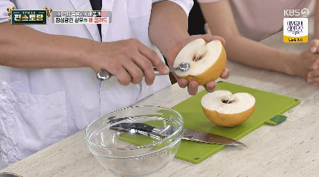 1. 배는 반으로 자른 뒤, 미니 스쿱으로 동그랗게 파냅니다.