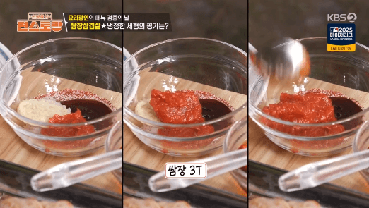 삼겹살을 구을 때 이상우씨 알려주는 쌈장소스를 발라가며 구워보세요. 삼겹살 맛이 훨씬 살아나요.