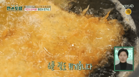 16. 2분간 튀긴 뒤 뒤집어서 3분간 더 튀겨줍니다.