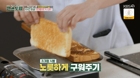 20. 기름을 두르지 않은 팬에 빵의 양면을 약불에서 노릇하게 구워줍니다.