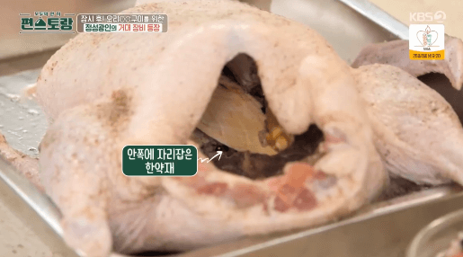 2. 찰밥, 한약재, 단호박, 연근채, 대추, 은행 등 속 재료를 오리 속에 넣습니다.