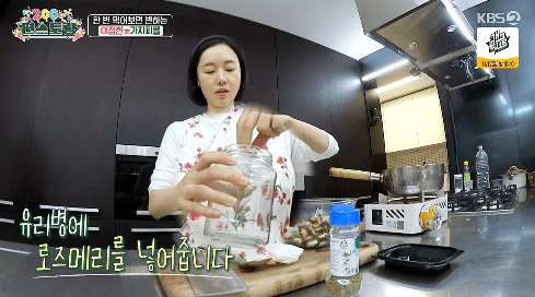 12. 열탕 소독한 유리병에 로즈마리를 넣어줍니다. (다른 허브를 넣어도 되고, 생략도 가능합니다.)