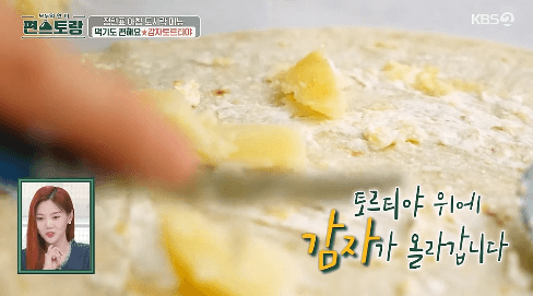5. 잘라 놓은 삶은 감자를 토르티야 위에 골고루 올려줍니다.