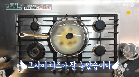 8. 뚜껑을 닫고, 약불에 치즈가 녹을 때까지 (5분 30초 정도) 구워줍니다.