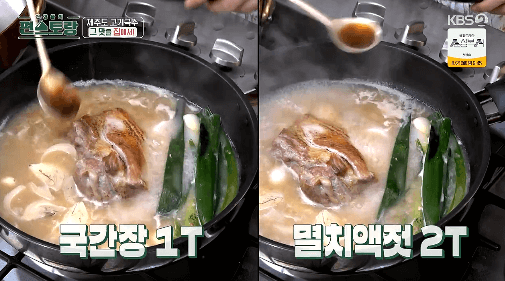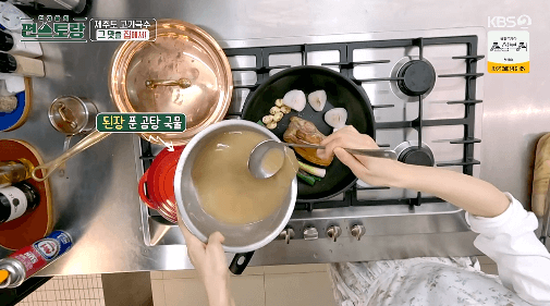 7. 여기에 된장 푼 곰탕 국물을 부어주세요.