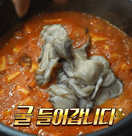 10. 강불을 유지한 채 세척한 굴을 넣고, 섞지 않고 살살 퍼트리기만 합니다.
