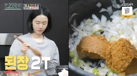 5. 양파의 향이 올라오면, 된장 2큰술, 고추장 듬뿍 1큰술을 넣고 볶아줍니다.