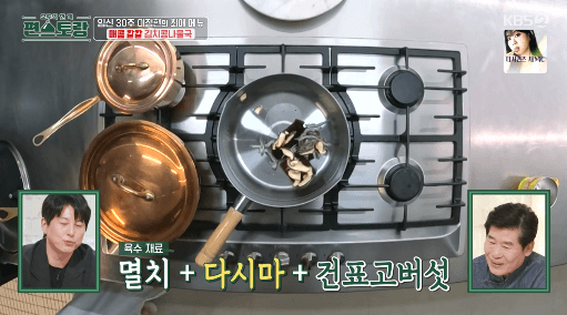1. 물 2리터에 멸치, 다시마 4~장, 건표고버섯 한 줌을 넣고 강불로 15분 끓여서 육수를 만듭니다.