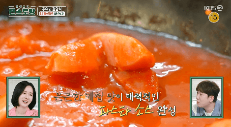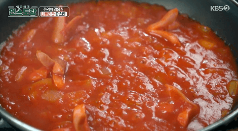 신상출시 편스토랑 | 이정현, 케첩과 소시지로 추억의 맛 소환★ 나폴리탄 파스타! 경양식 집에서 먹던 바로 그 파스타 ■ 요리 재료 파스타면 1인분, 토마토홀 3개, 케첩 2T, 치킨스톡(액상) 1/2T,