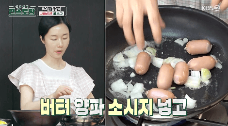 3. 버터가 녹으면, 양파와 소시지를 넣고 볶아줍니다.
