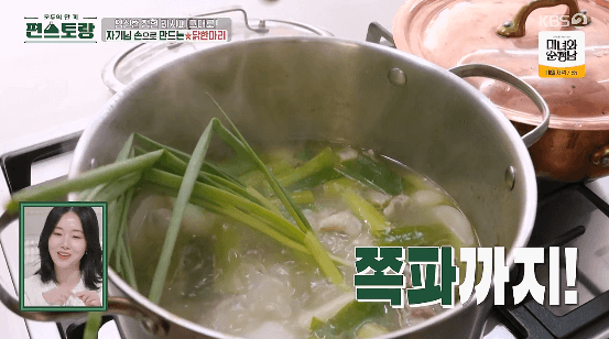 4. 대파 3대를 적당한 크기로 잘라서 뿌리까지 냄비에 넣어줍니다. (삼베주머니에 넣어줍니다.)