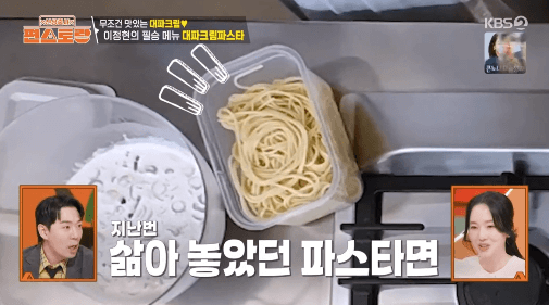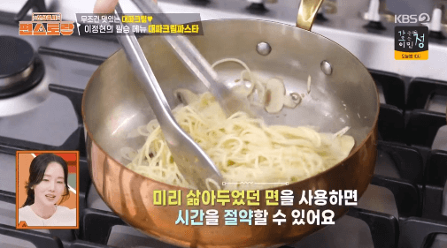 파스타를 만들 때 면을 미리 삶아뒀다 파스타 요리에 바로 사용할 수 있는 방법을 이정현씨가 알려준다고 합니다. 그리고, 미리 삶아 놓은 면으로 금방 만들 수 있는 파스타 요리법도 알려준다
