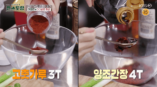 3. 고춧가루 3큰술, 양조간장 4큰술을 넣습니다.