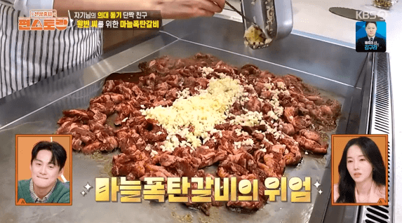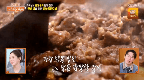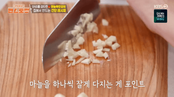마늘을 잘게 다져서 넣어서, 마늘의 풍미가 가득한 마늘폭탄갈비를 만들어 보겠습니다. 이정현씨는 마늘폭탄갈비를 만들고, 달래 된장찌개를 만들었는데요. 꿀에 연육한 갈빗살 한 줌과 지방, 근막을 달래 된장찌개를 만들 때 사용했습니다.