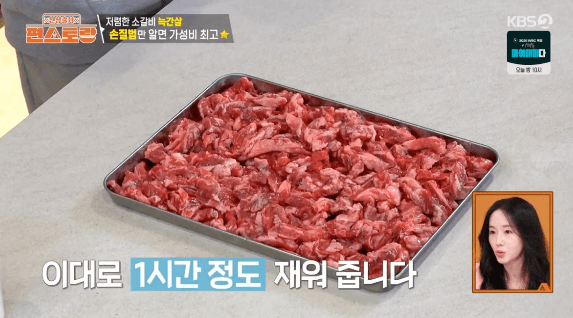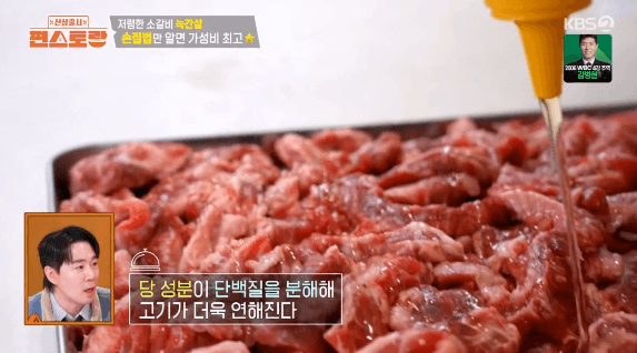 5. 고기에 꿀 듬뿍 3큰술, 소금 1/2큰술, 후추 2작은술을 넣고 버무리고, 냉장고에 1시간 동안 재워둡니다. (이정현씨는 꿀로 연육한 갈빗살을 된장찌개를 만들 때 사용했습니다.)