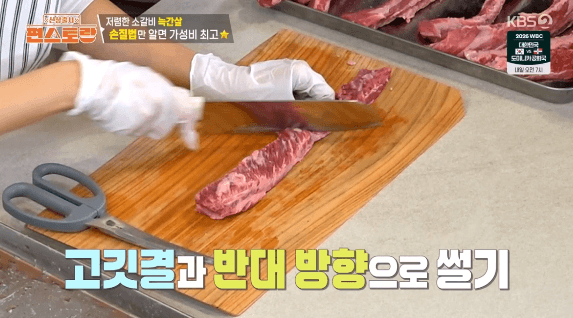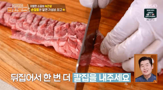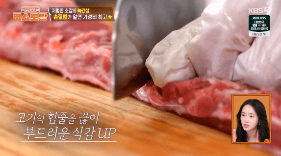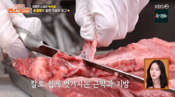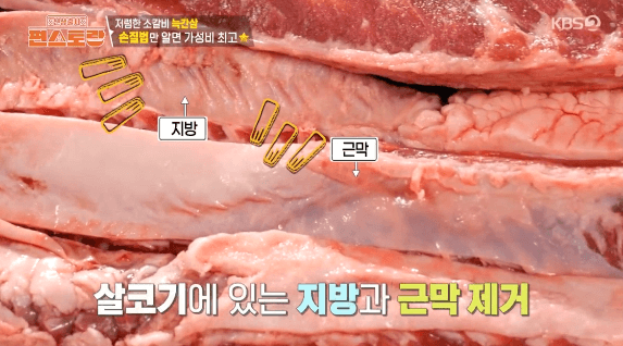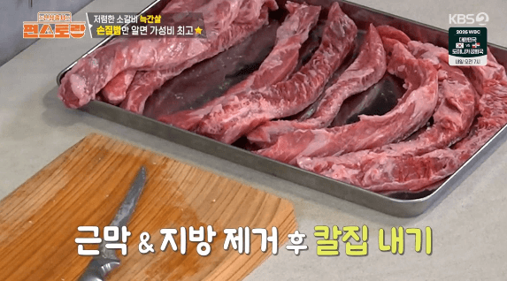 2. 고기에 붙은 지방과 근막을 칼로 제거합니다. (이정현씨는 지방과 근막을 달래 된장찌개를 만들 때 사용했습니다.)