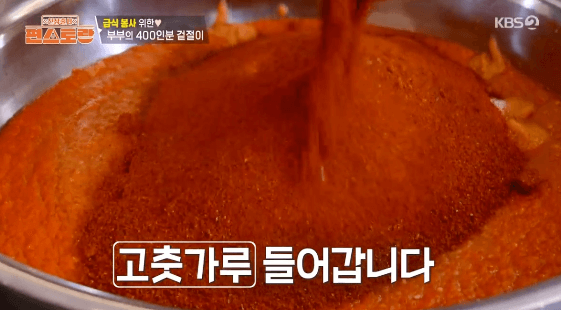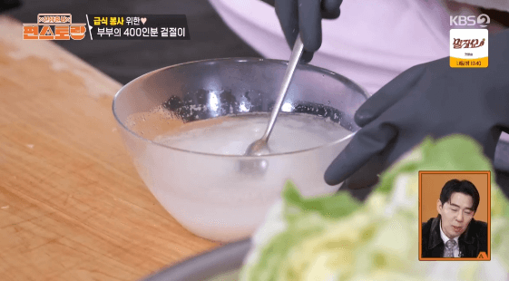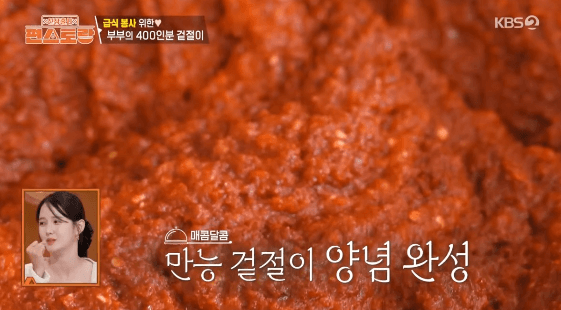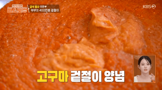 맛있는 양념으로 배추 겉절이 만들어 볼까요? 이정현씨는 배추 겉절이에 밀가루풀이나 찹쌀풀을 쑤지 않고, 삶은 고구마를 넣어서 은은한 천연 단맛을 낸다고 합니다.