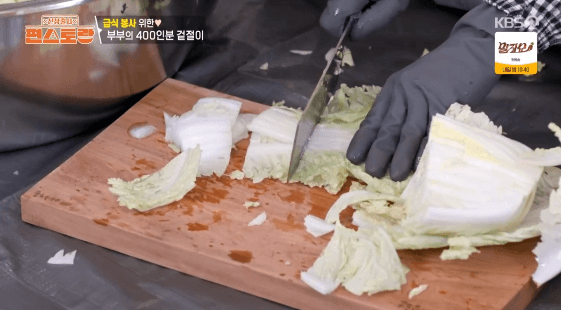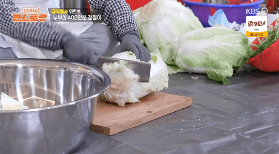 3. 배추 밑동을 자르고, 반으로 가릅니다.