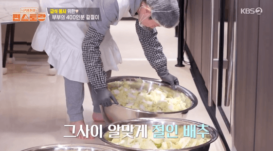 6. 배추에 소금물을 붓고, 소금 한 줌을 더 뿌려 버무린 뒤 30분간 절여줍니다.