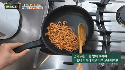 4. 마른 팬에 건새우를 볶고, 믹서기에 갈아 건새우가루를 만듭니다. (건새우는 살짝 볶아서 비린내를 날려줍니다.)