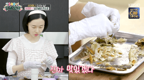 ※ 이정현씨가 보리굴비 손질을 하다가 잠깐 먹방을 하시네요. 물에 녹차가루 넣고 녹차물 만들어서 밥에 말아서 보리굴비 올려서 먹는 일반적인 보리굴비 먹는 방법입니다.