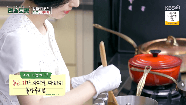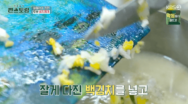 11. 비지찌개에 채소도 들어가야겠죠. 아기를 위한 찌개니깐, 백김치를 넣습니다. 이정현씨는 백김치의 연한 배춧잎을 쓰셨네요.