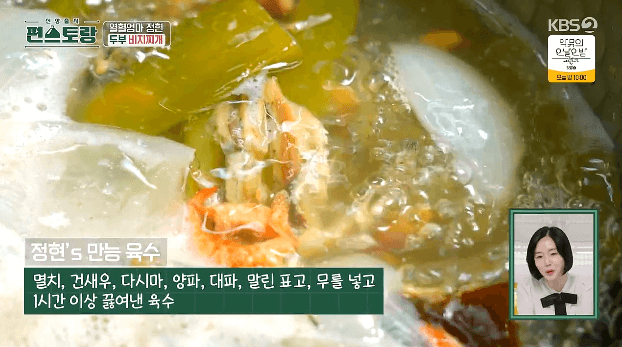 요리시간을 단축시켜주고, 맛은 더 맛있게 해주는 이정현 만능육수는 멸치, 건새우, 다시마, 양파, 대파, 말린 표고버섯, 무를 넣고 1시간 이상 끓여서 만듭니다.