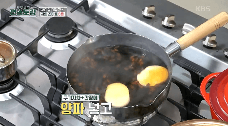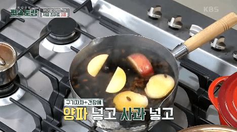 4. 구기자와 간장에 들어 있는 냄비에 양파와 사과, 올리고당을 넣고 강불에서 끓여줍니다.