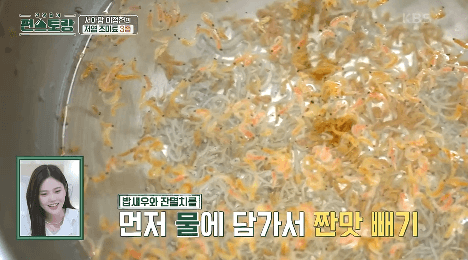 1. 주재료인 밥새우와 잔멸치는 물에 10분 정도 담가서 짠기를 빼줍니다.