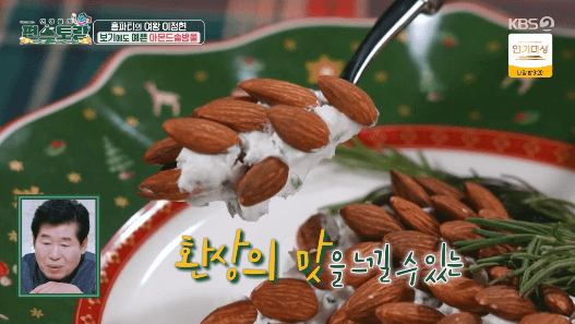 이번 방송에서는 이정현씨가 연말 파티를 준비하는 음식들을 만들었는데요. 아몬드송방울과 눈사람샐러드는 정말 분위기 내기에 좋은 음식인 것 같습니다. 보기만 해도 기분이 좋아지는 요리 만들어보세요.