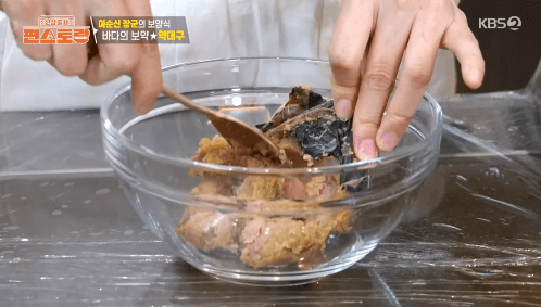 2. 발라낸 약대구의 알을 으깨줍니다.