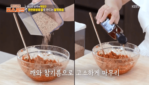 5. 매실청 3큰술, 깨 1큰술, 참기름 1큰술을 넣고 골고루 섞어줍니다.