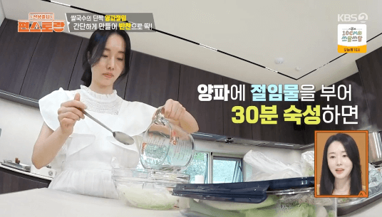 따로 재료를 구할 필요 없이 양배추로 양배추찌개를 끓이고, 단단한 심지로는 피클을 만들어 보세요. 알뜰한 장신영씨의 레시피로 남기는 거 없이 알차게 반찬 만들어 보세요. - 남보라의 깻잎