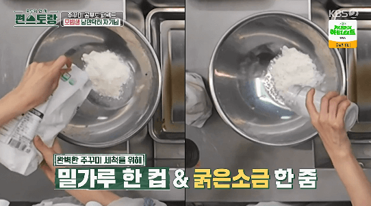 5. 쭈꾸미에 밀가루 한 컵과 굵은소금 한 줌을 넣고 빡빡 문질러줍니다.
