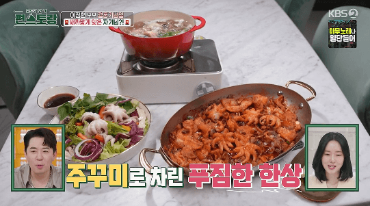 10. 이번 방송에서는 쭈꾸미로 만든 쭈꾸미 샐러드, 라조장 쭈꾸미 삼겹살, 쭈꾸미 연포탕으로 한상이 차렸습니다.