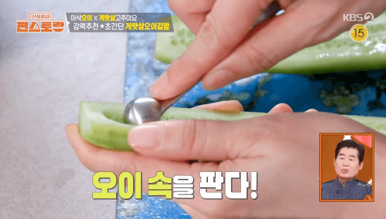2. 오이 씨를 긁어냅니다. (오이씨를 제거하고 절이면 오이가 무르지 않고, 아삭아삭한 식감을 유지할 수 있습니다.)