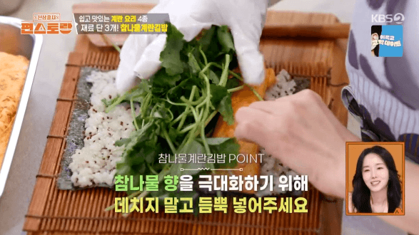 이정현시 레시피로 몽글몽글한 계란말이와 향긋하고 신선한 참나물을 가득 넣은 김밥을 만들어 보겠습니다.