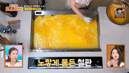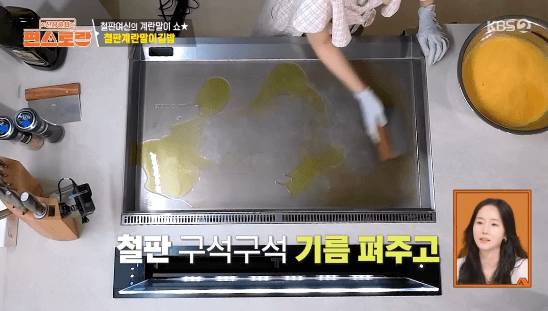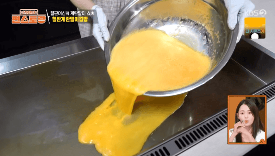 8. 달군 팬에 기름을 두르고 계란물을 붓습니다. (팬은 중약불, 철판은 150도로 맞춰 계란이 타지 않게 천천히 익혀줍니다.)