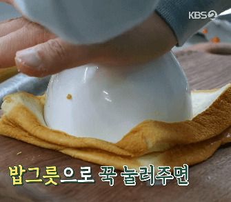 17. 식빵을 밥그릇으로 꾹 눌어서 찍어줍니다. 테두리의 식빵은 떼어냅니다.