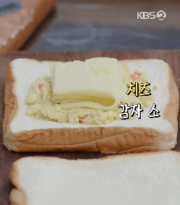 14. 만들어 놓은 감자소를 식빵의 가운데에 펴놓습니다.