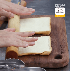 11. 식빵을 밀대로 얇게 밀어줍니다. 식빵 2장이 한 짝이 됩니다.